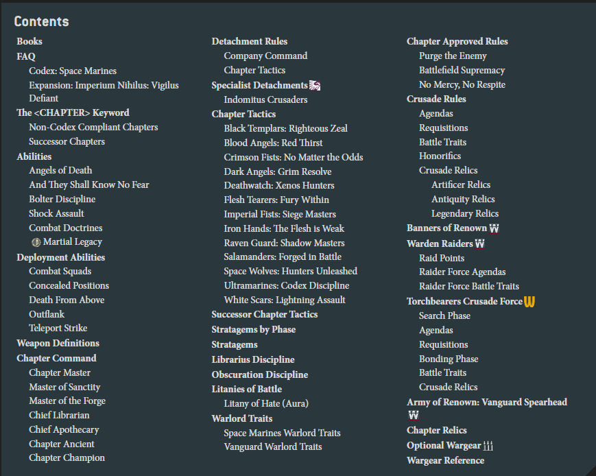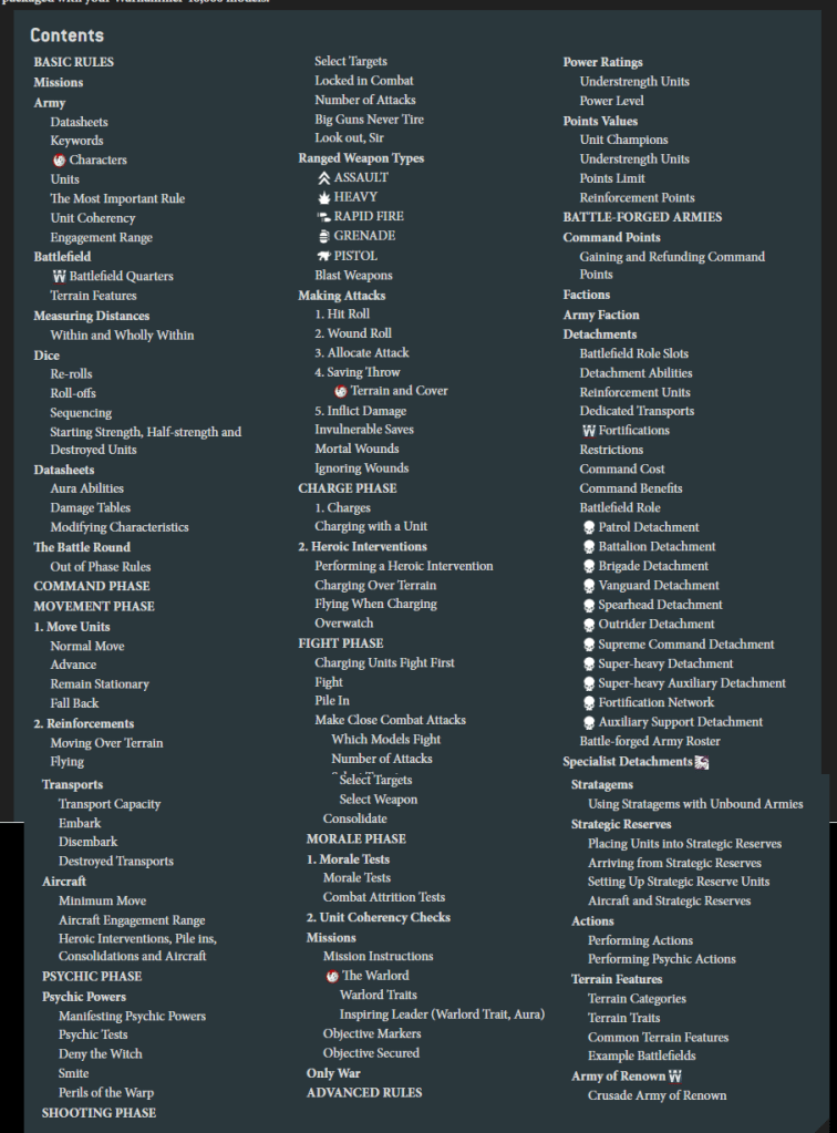 Warhammer 40ks rules, shown above from Wahapedia, is actually pretty lengthy. When you consider that infinity lacks things like transports, flyers detachment types, stratagems and so on it really reduces the amount of rules required.
