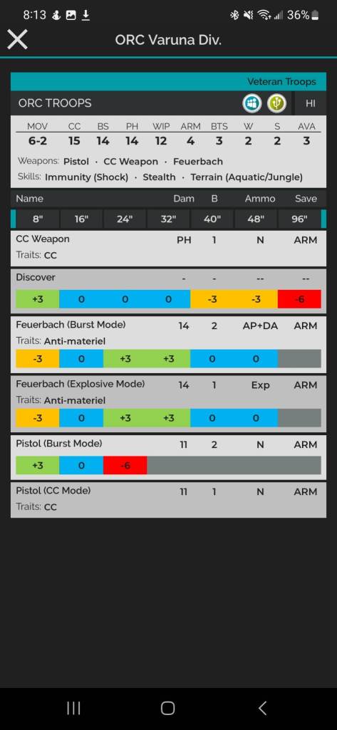 Above is actually a pretty complicated ORC trooper. Varuna Division ORCs have a few extra rules, and the feuerbach has different shooting modes, but overall, not nearly as many special rules going on here. Obviously there are examples where 40k models might have less special rules than infinity models, but I chose to compare the most basic HI in Infinity to the most basic infantry unit in the most popular and access able Warhammer army.