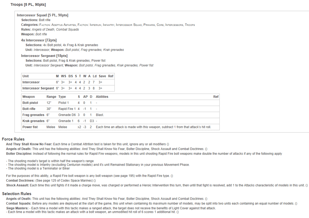 Above is a basic Imperial Fist intercessor Squad. I am out of touch with 40k these days but this is in my estimation a very simple troop choice. Look at the heap of rules and all of the weapons just in this very basic squad