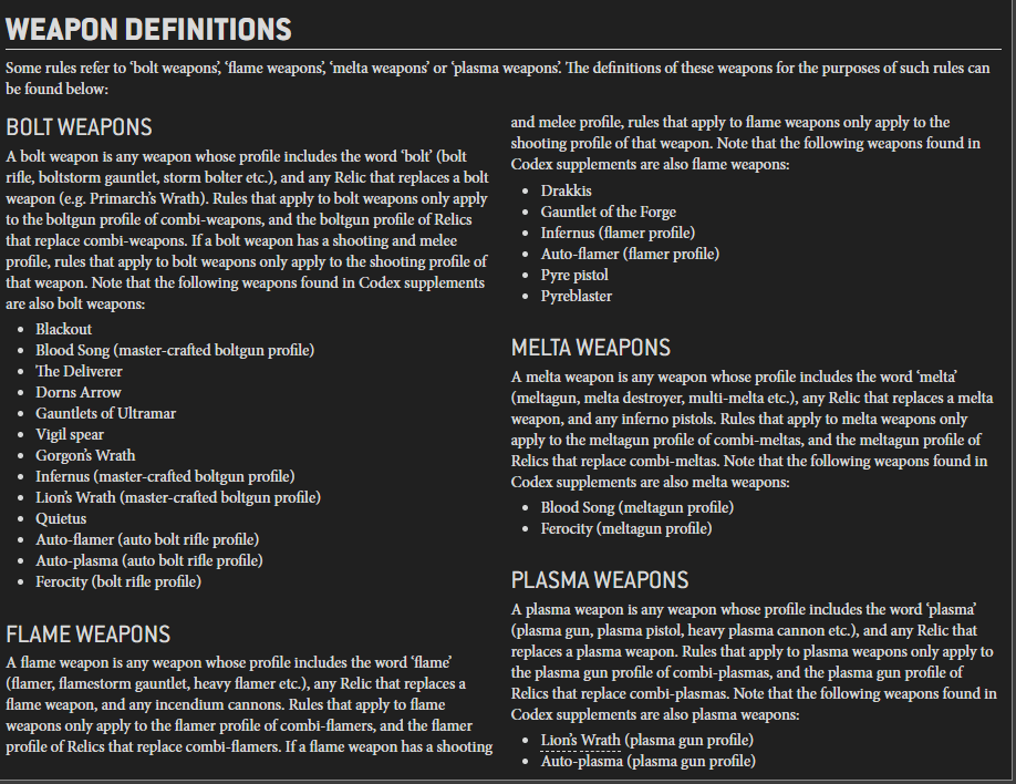 I can’t even present a good comparison for 40k here, so just the fact that there’s a page of weapon definitions for space marines that define what kind of weapon each gun is is telling. There are a lot of them, and these are either unique to space marines or the imperium. Orks, Tau, Eldar, and so on each will have their own section of weapons, their category, and stats that you cant hope to memorize without a lot of playtime or study.