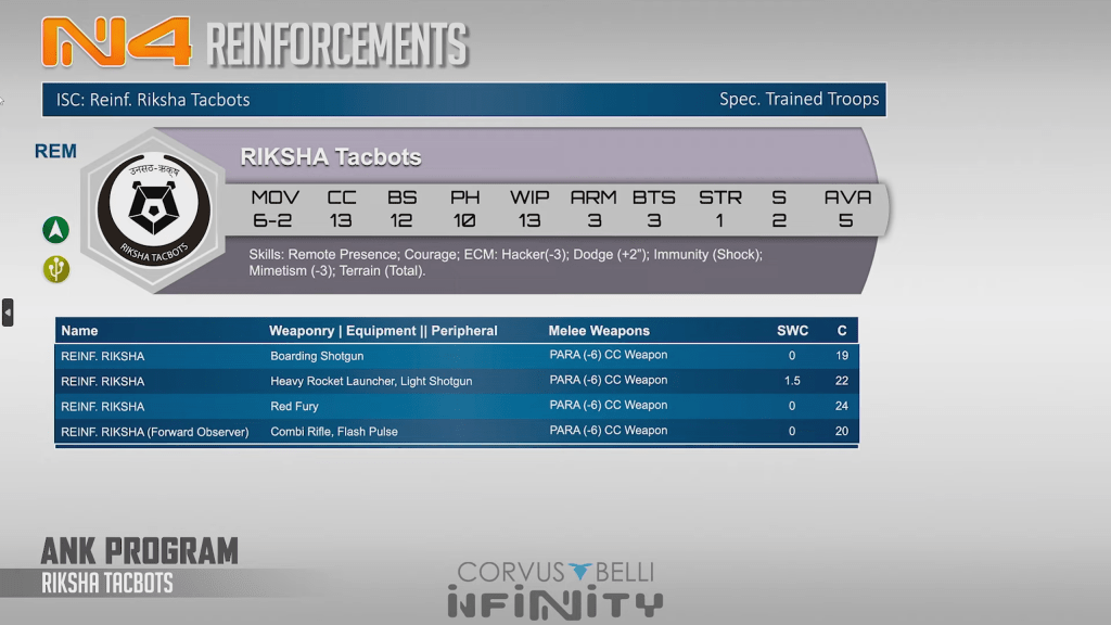 Riksha Tacbots are insane. This is an Arm 3 Dakini with ECM hacker 03 and some very good weapon options. a 0SWC red fury here is insane, and the specialist option is always nice. Boarding shotguns and rocket launchers are also very powerful midfield tools. These guys are AVA5 and can core fireteam, and its important to note that an evo hacker can drop marksmanship on them if a repeater is available.