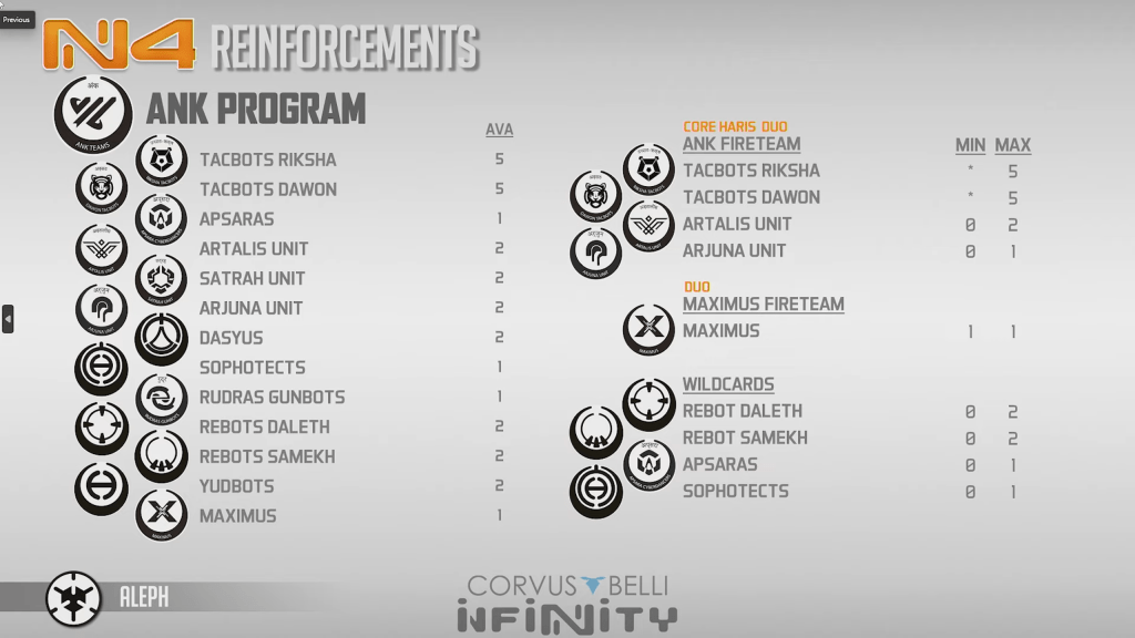 The fireteams here are pretty varied, with most of your robots and the arjuna able to team up. We still dont know what the Artalis is, but even without that knowledege this selection i svery strong. Rudras getting into the midfield, along with sophotects and yudbots for on demand healing and engineering is very good. A huge winner here is the Arjuna unit, who combined with their kirin bots are the bane of most tags and HI in the game but struggle to get into the midfield effectively, now they get there in your reinforcements. Overall this is just a powerful toolkit of specialists, cc and template trading pieces, mid range gunfighters, and utility pieces that its hard to imagine wont round out any Aleph army. Turn one Achilles rampage never looked so good, because when he does finally die that turn, you just get first crack at 100 point points of pain coming in.