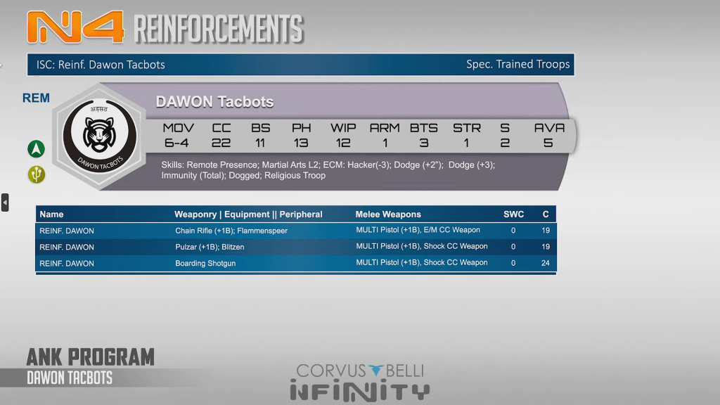 Dawon tacbots are your new warband dakini. They specialize in close combat and nasty template weapons. Dogged total immune close combat oriented models are very dangerous, and these guys will often trade up or be a very dangerous roadblock to try and pass. Their CC skill is pretty remarkable, with burst 2 cc22 MA2 they actually have good odds against even the most skilled of enemy combatants