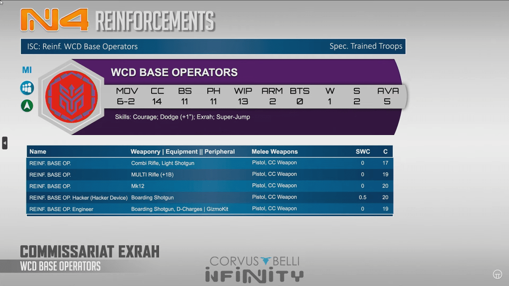 The Base operators are a basic, but cheap, MI. They have pretty bad stats overall but are fast and have some good weapon options. The engineer specifically will make it into a lot of lists for a late game fast specialist.