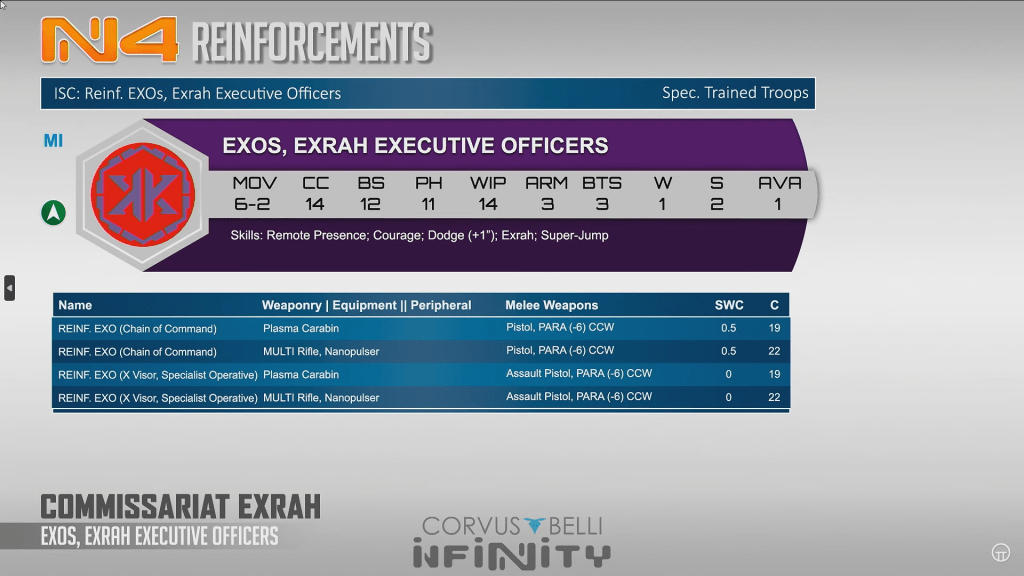 Exrah Executive officers are arm and bts 3 M with slightly better stats. They come packed with either chain of command or xvisor and specialist operatives. The plasma carbine assault pistol xvisor specialist is particularly dangerous at 19 points. Solid profiles for right around that 20 point cost.