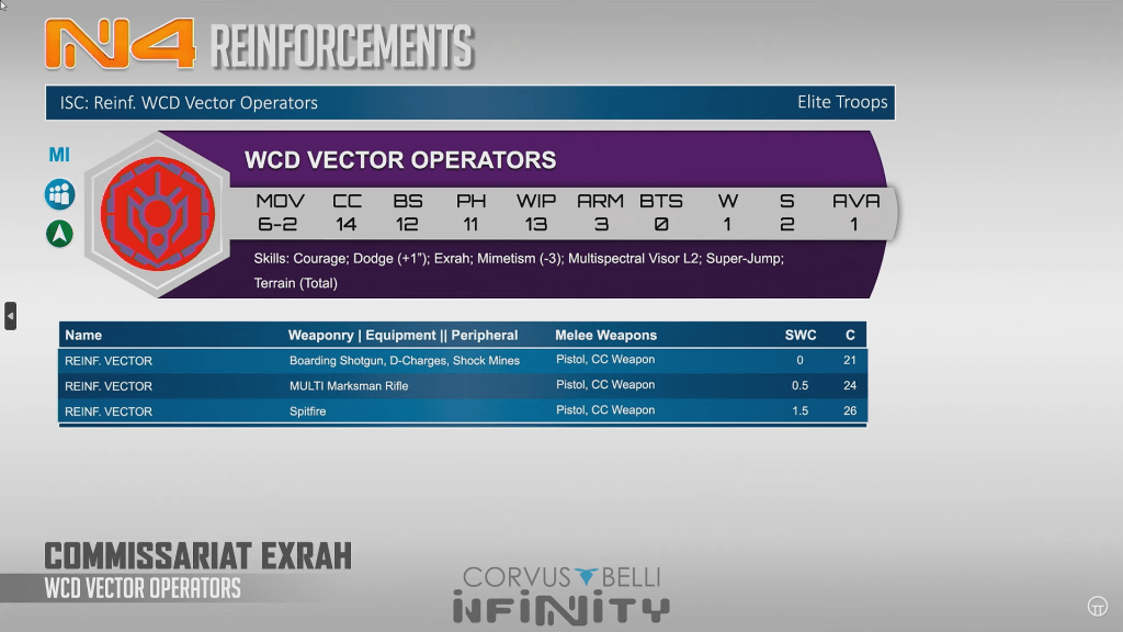 Vector operators are nuts. these are basically bs12 nisse with the reinforcement deployment scheme at well under 30 points. the spitfire at 26 points is insane value that punches well above its point cost. I have no idea what math happened here to make this profile 6 points cheaper than a yaogat with spitfire but I am sure it has nothing to do with having to internally compete with already bonkers combined army profiles.