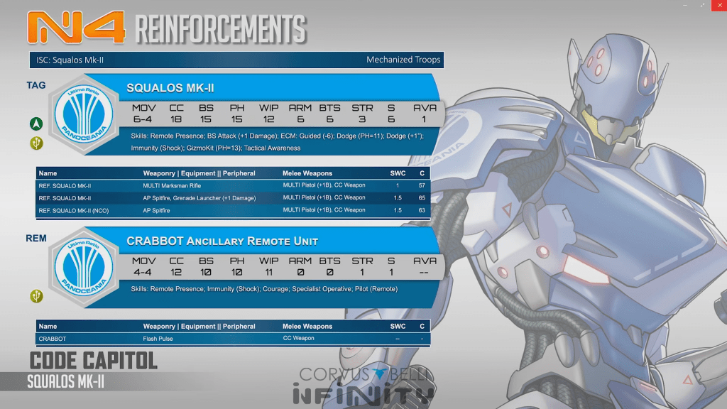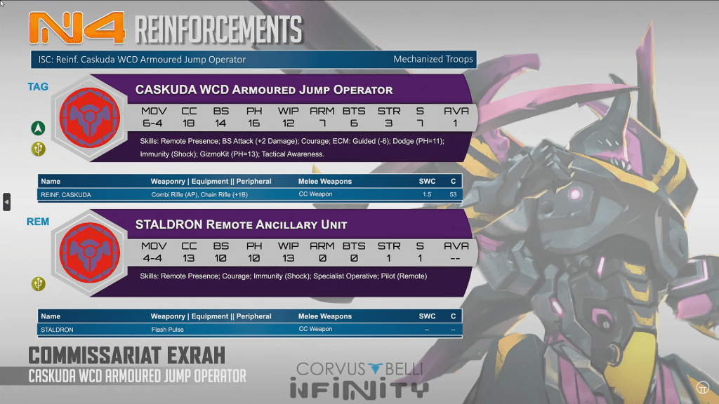 The Caskuda is a medium tag with short range weapons. Damage 15 AP Combi rifle is weird but slaps pretty hard, and the burst 2 chain rifle at damage 15 is also very dangerous. The main draw of the reinforcement Caskuda is that it is pretty inexpensive at 53 points. It is likely going to appear in good range for its combi rifle. It is pretty cool.