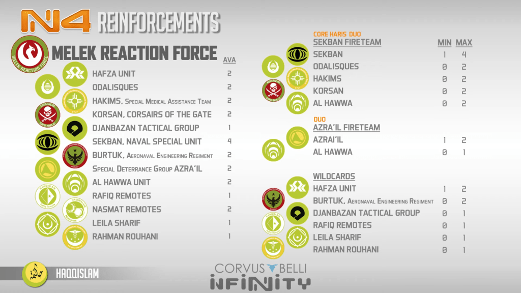 Interesting firteam options combined with HAFZA wildcards make it really hard to unpack what is going on when these guys arrive. The Azrail is an interesting choice here with its long range weapons but maybe its a good way for this guy to appear and gun down a badly placed tag out of nowhere. If the Rafiq Red Fury makes it in and marksmanship stays around I would look out for that wildcard combined with the engineer to keep it up and fighting.