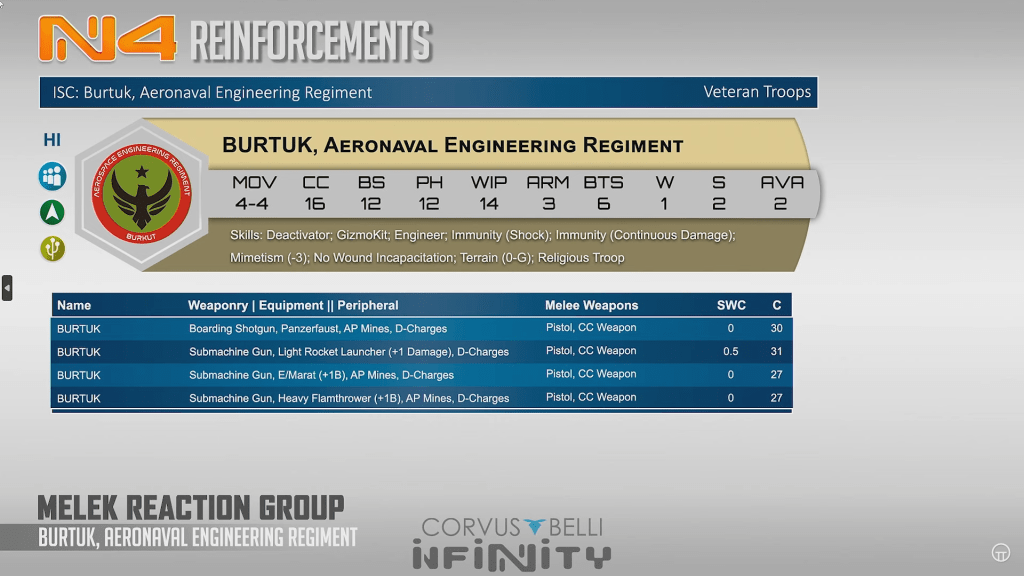 The Burtuk is a premium near 2 wound heavy infantry engineer. it only has close range weapons but it is priced extremely aggressively and is a good wip 14 engineer. Think of this guy as a Haqquislam close range EVAder.