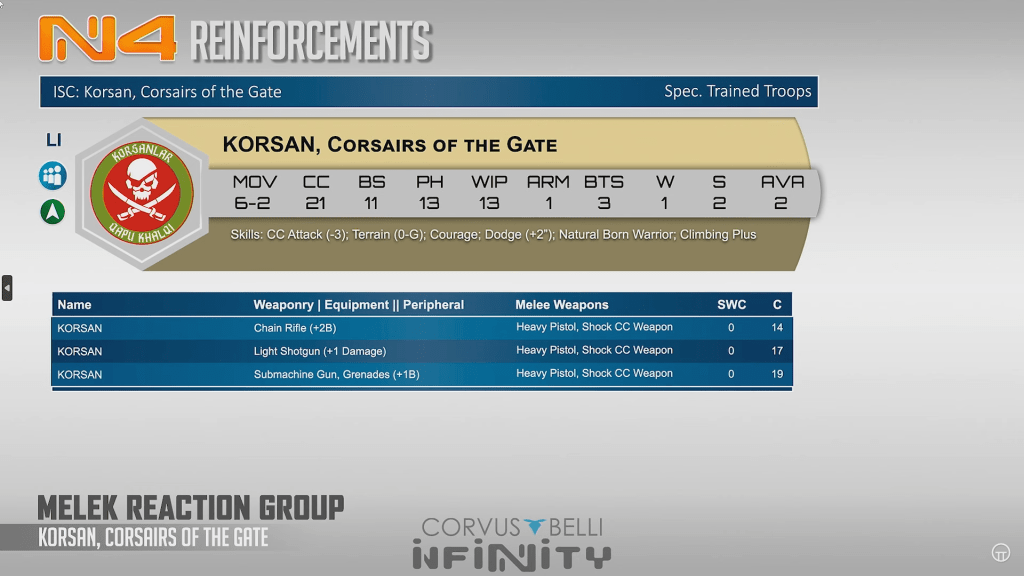 Koran is a weird close range pirate guy who has close range weapons and reasonable CC skills. Shock ccw and heavy pistol is not the most impressive thing but the burst 3 chain rifle is pretty funny and at a reasonable points cost.