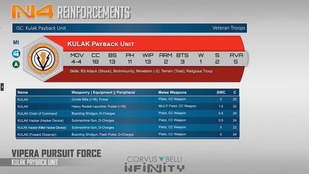 Kulak are mimetism medium infantry with lots of close range options as well as a HRL option. The specialist options are pretty cool and a bs13 mimetism HRL is pretty dangerous. The real thing here is Chain of command, yet another new addition to nomads this year. These are solid bs13 mimetism troopers mostly equipped with close range weapons.