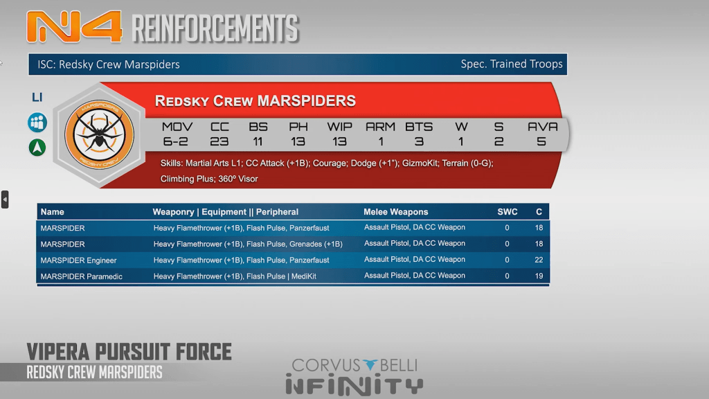 Marspiders are brutal close range specialists with extra burst flamethrowers and assault pistols to fight their way into combat. DA CCW and good cc stats make them very dangerous up close. Fireteaming with a Lizard is weird but really cool.