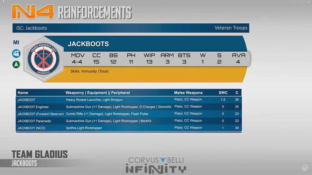 Jackboots are a cool total immune arm 3 bts 3 medium infantry with good kit . They have good varied specialist options that can help round out the fireteams they may be interested in being a part of. NCO is always good, and SMGs in the midfield are very powerful. Try not to think about the cost of the new models from Aleph and Combined Army as you look at these though or your head will start to hurt a bit.