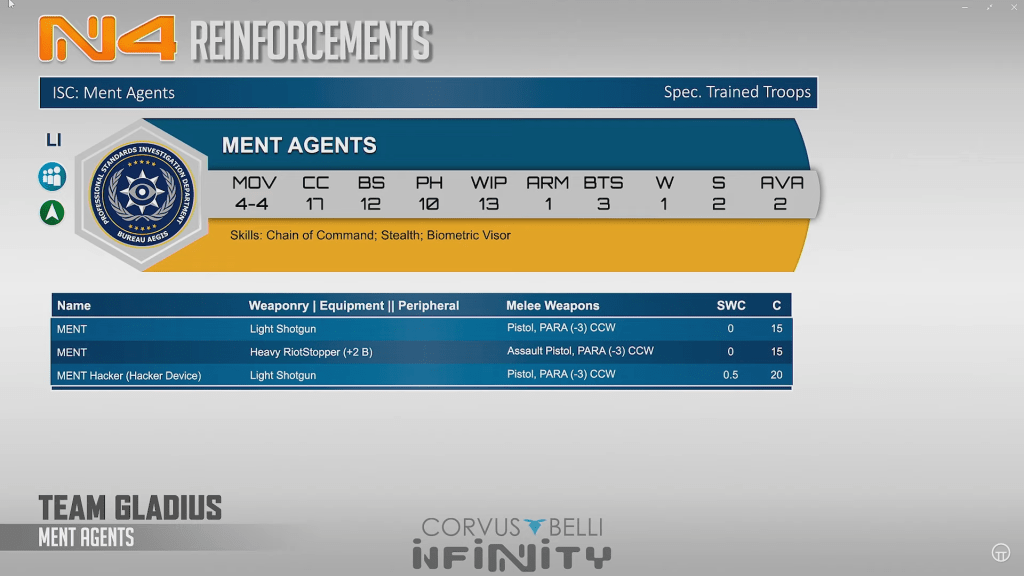 Ment agents are amazing utility pieces. All having chain of command and biovisor, there’s some really filthy options here. The burst 3 riotstopper with assault pistol for 15 points should terrify any tags or fireteams she comes near, and the hacking profile provides nice utility on a stealth body.