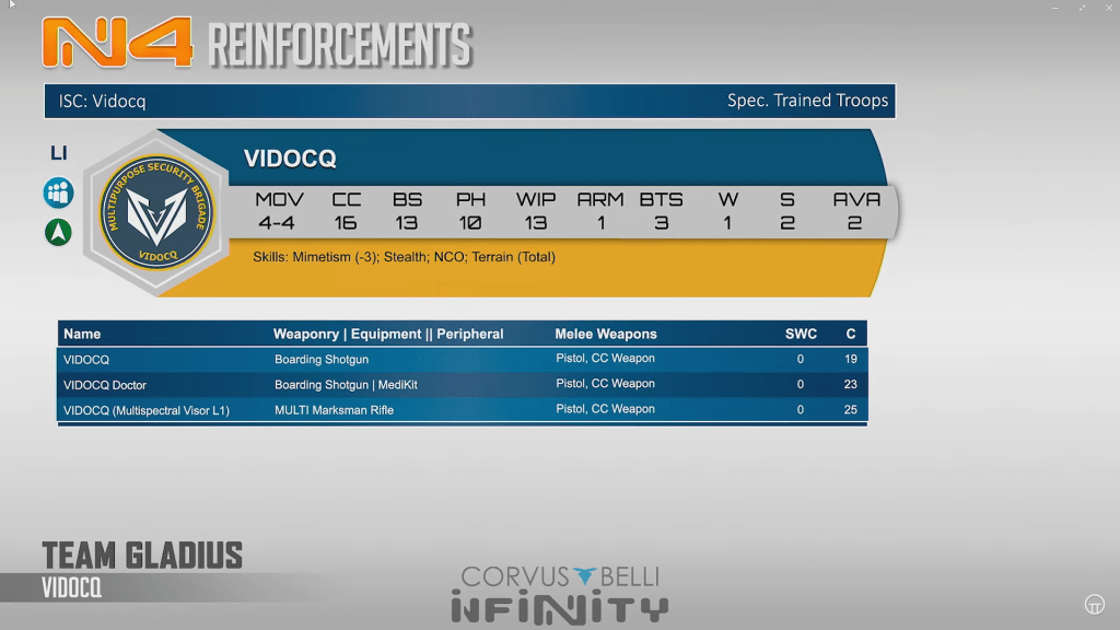 VIDOCQ (Vid-oh-cock?) are another NCO option with some sweet things going for them. Light infantry with mimetism and bs13, these guys and or gals provide boarding shotguns, doctors, or msv1 MMR to your reinforcements for a really budget package.