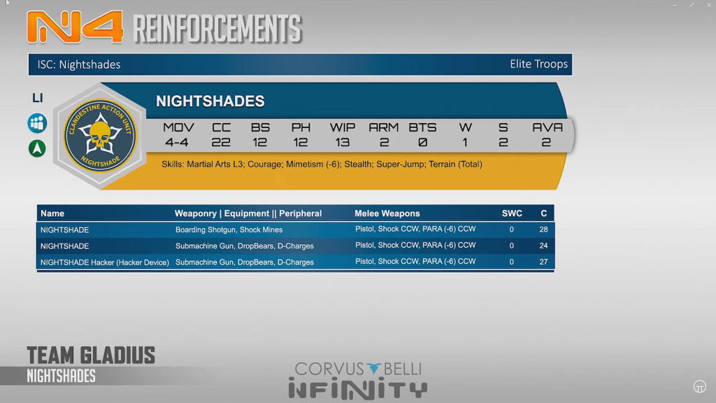 Nightshades are a mim-6 Ninja type guy without camo but with close range weapons, mines or dropbears, and access to dcharges and hacking devices This seems like a pesky midfield piece, but maybe one I am not super excited to field. That cool ass sword being a shock ccw feels a bit silly too.
