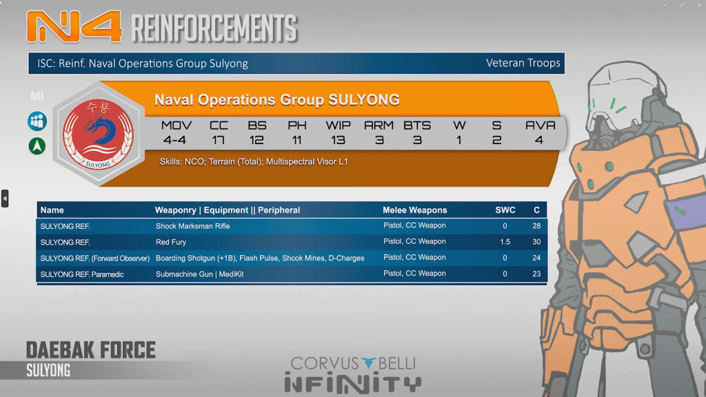 Sulyong are pretty handly little msv1 gunfighters with some good specialist options. NCO should provide some good synergy with your daoying. The forward observers shotgun is especially scary in close.