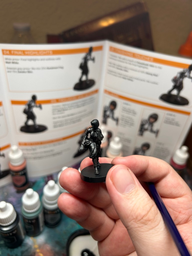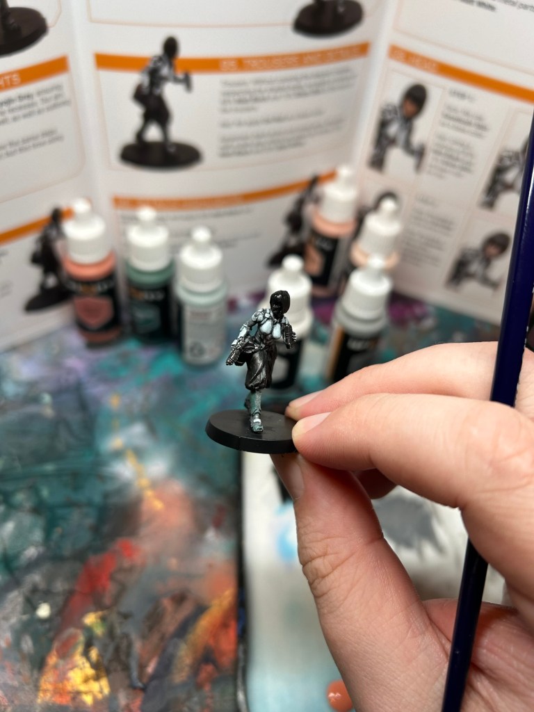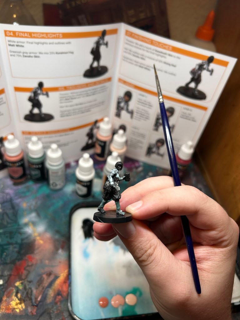 The start of the basecoats have you mix your black paint with your two base greys. I’m a competent painter so it was pretty easy to eyeball, but something I wish the tutorial booklet did was provide more specificity to the areas that should be “green grey” and “white” but I guess that’s up to the painter. Personally I would have just painted all the “hard” armor panels white and the “soft” armor green grey but to each their own. Going from dark to light you mix your greys together and finally end with extreme white highlights.