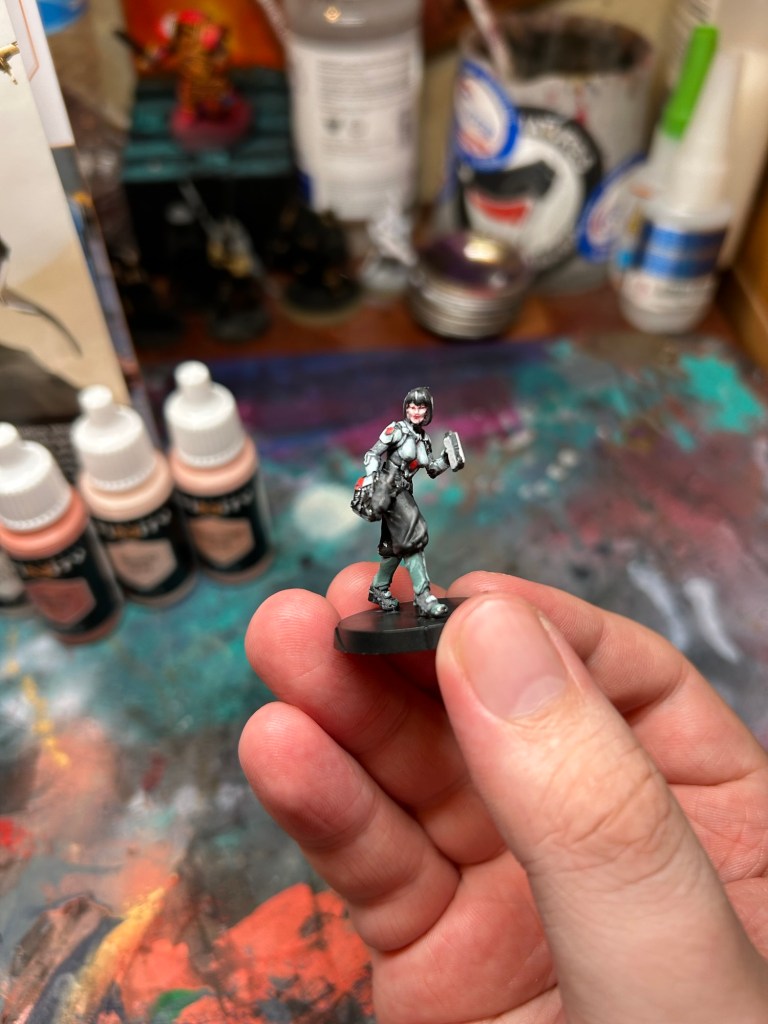 The rest of the details on the model went pretty quickly. A few red accents on the shoulder pads and center of the chest armor were very easy dark red then light red. Something that took me a little more time and proved to be far more annoying were the bags and med-gun. Non metallic metal has always been a pain for me(I struggle to identify my primary light source and stick with it), and I did struggle to get the right contrast for the black leather as well.