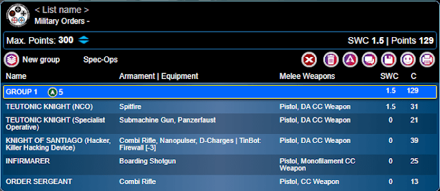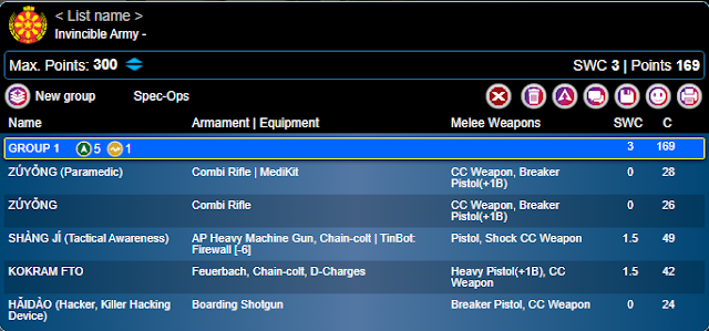This example is a little more budget for similar capabilities. It has a Doctor, a spitfire for attacking, a Killer hacker with tinbot firewall, and plenty of templates for when things get up close and personal. This fireteam is a bit more vulnerable to hacking when compared to the Invincible Army Fireteam, and is a little less effective at cracking armor and long range by comparison, but saves some significant points in the process.