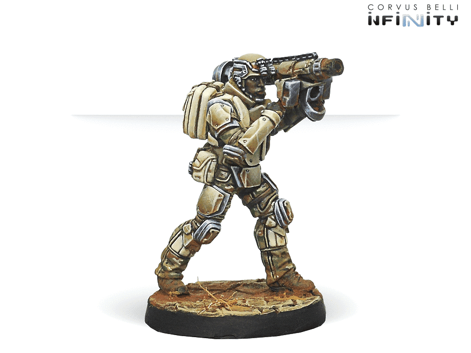 The MSV 2 Multi sniper Kamau is really problematic for many armies to deal with, while the remaining fusiliers exist to provide inexpensive orders, protect your lt, and have some hacking utility. This fireteam really doesn’t want to move up the table as midfield fusiliers are not that powerful and extremely vulnerable. This can be done with less premier pieces as well, replacing the 32 point Kamau with a 15 point Fusilier Missile can be as problematic and force your opponent to risk very expensive pieces to deal with something really inexpensive.